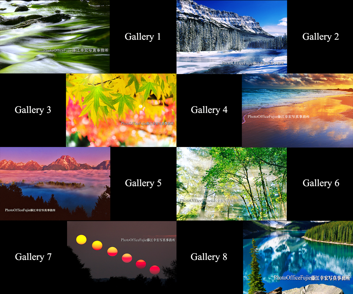 Landscape Photo gallery 写真家・藤江幸宏が長年撮り貯めた写真の一部をスライドショーにしております。 下部の文字部分をクリックしてフォトギャラリーをお楽しみください。 Please enjoy the photo gallery by clicking the letters at the bottom. |